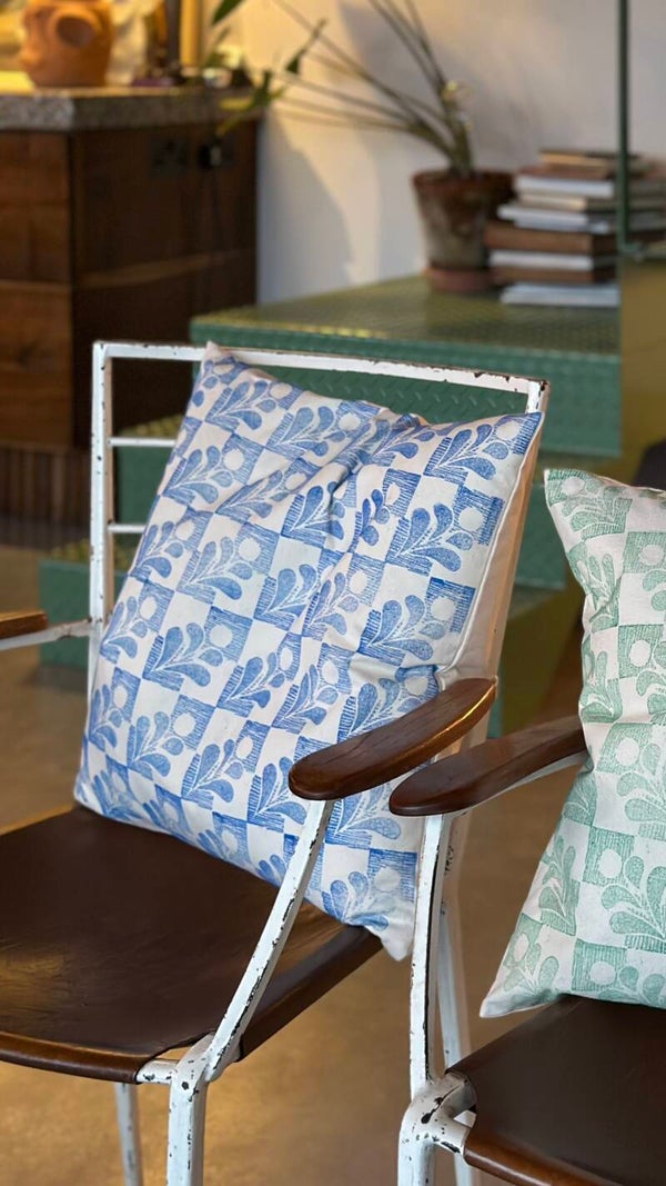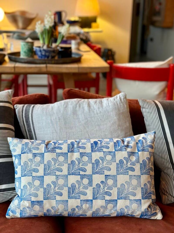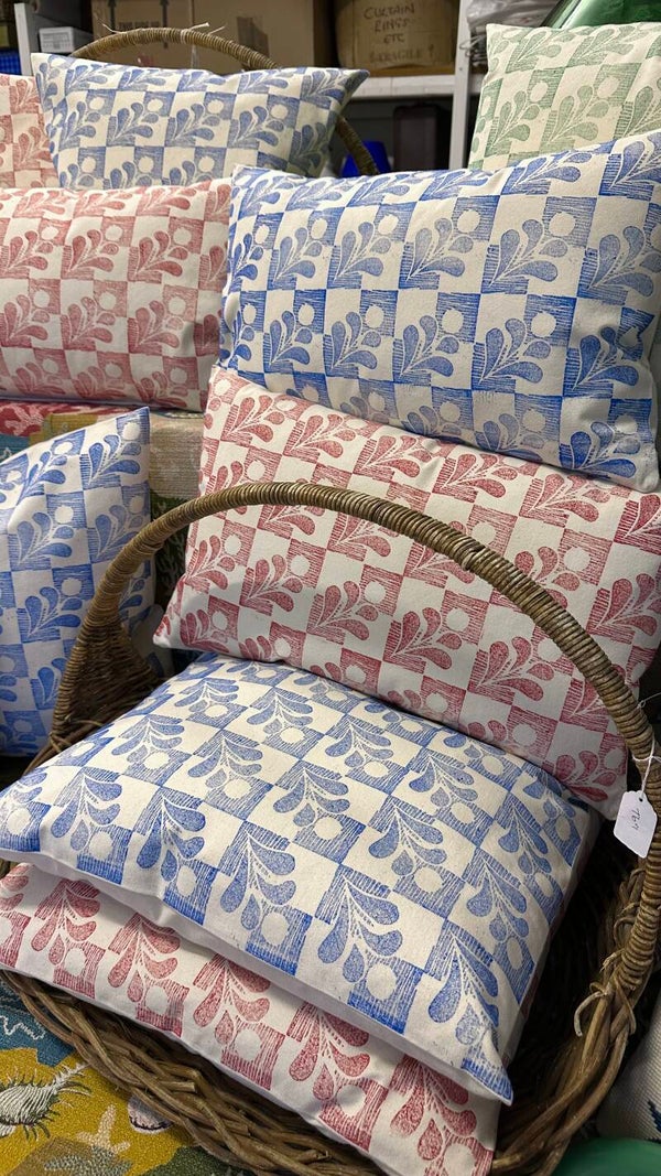 A rectangular or square calico, zipped, cushion with a feather pad. Hand printed on the front with my own stylised oxeye daisy lino cut block, with all the wonderful chacteristics of a hand printed fabric.